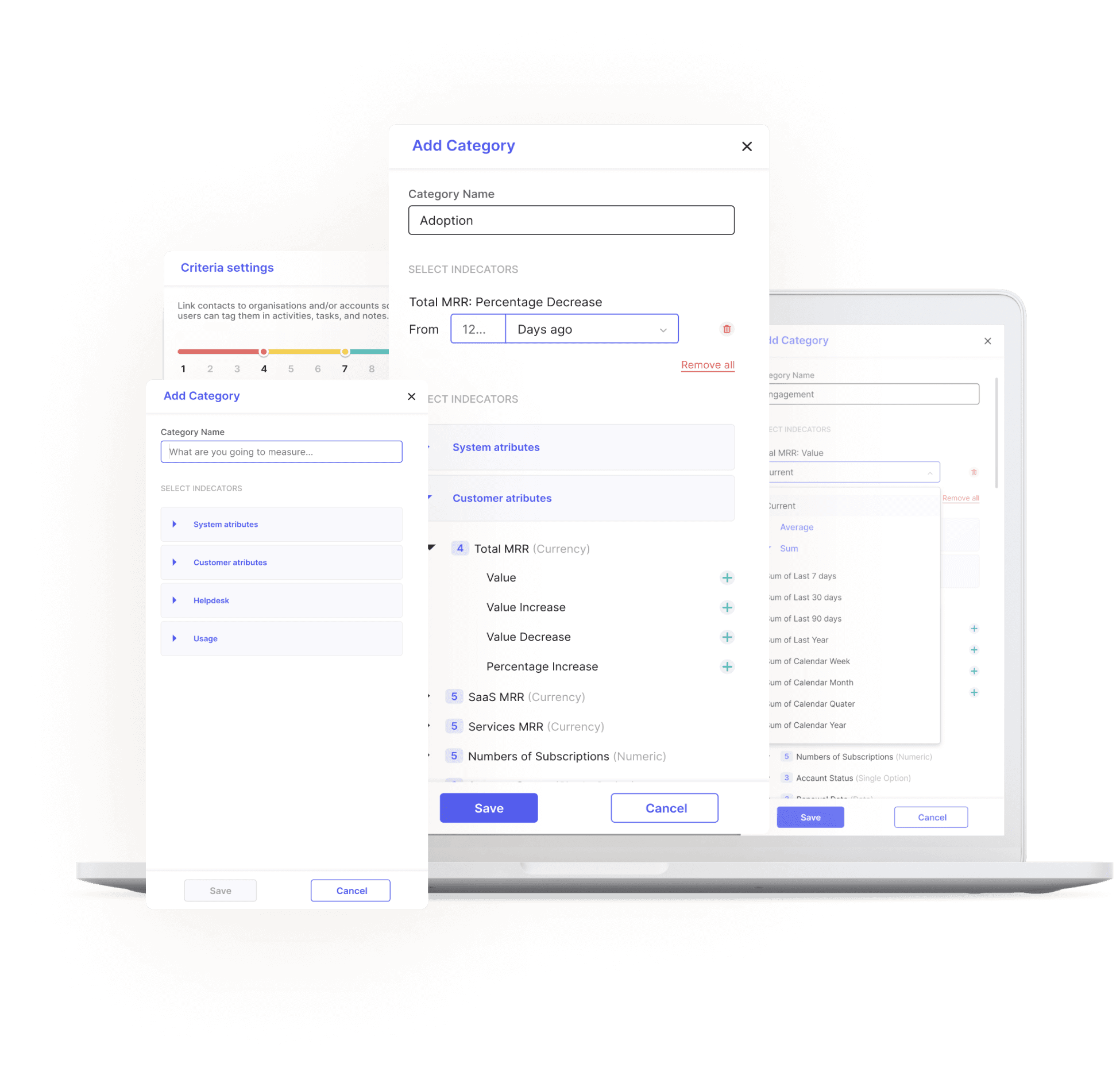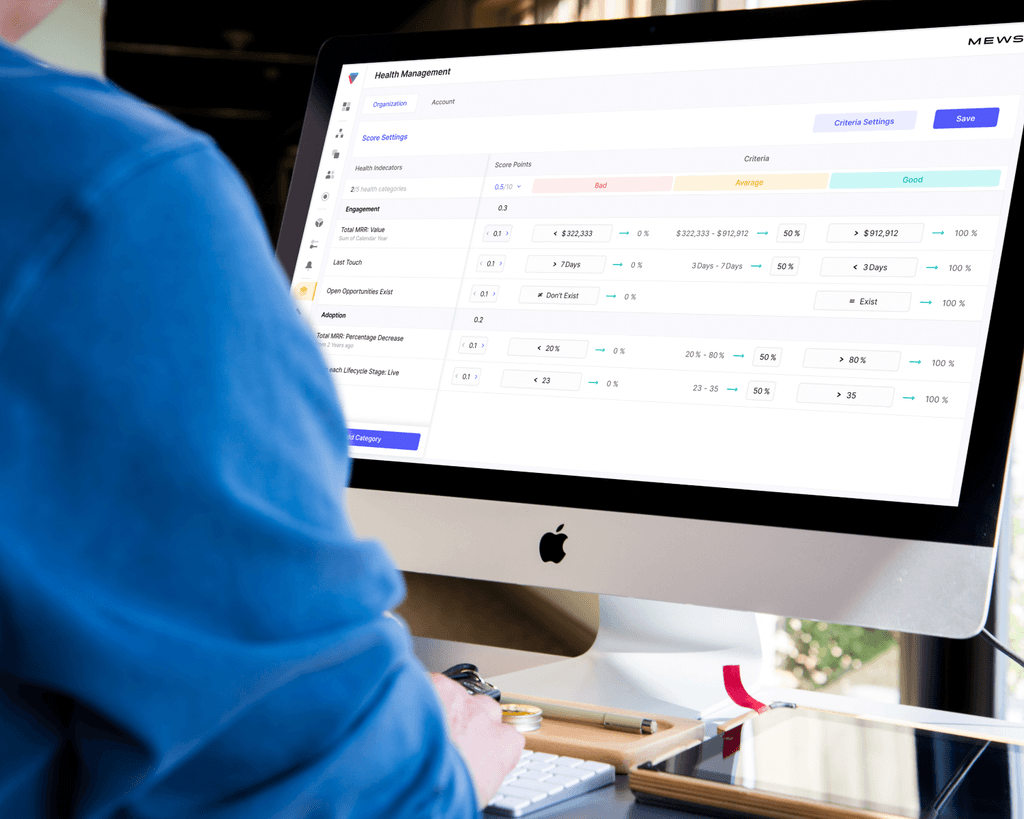 The grid is used as an overview of the customer health management. At the same time it is the place where the users can set up the Bad, Average & Good criterias for health indicators using the hybrid step by step inputs