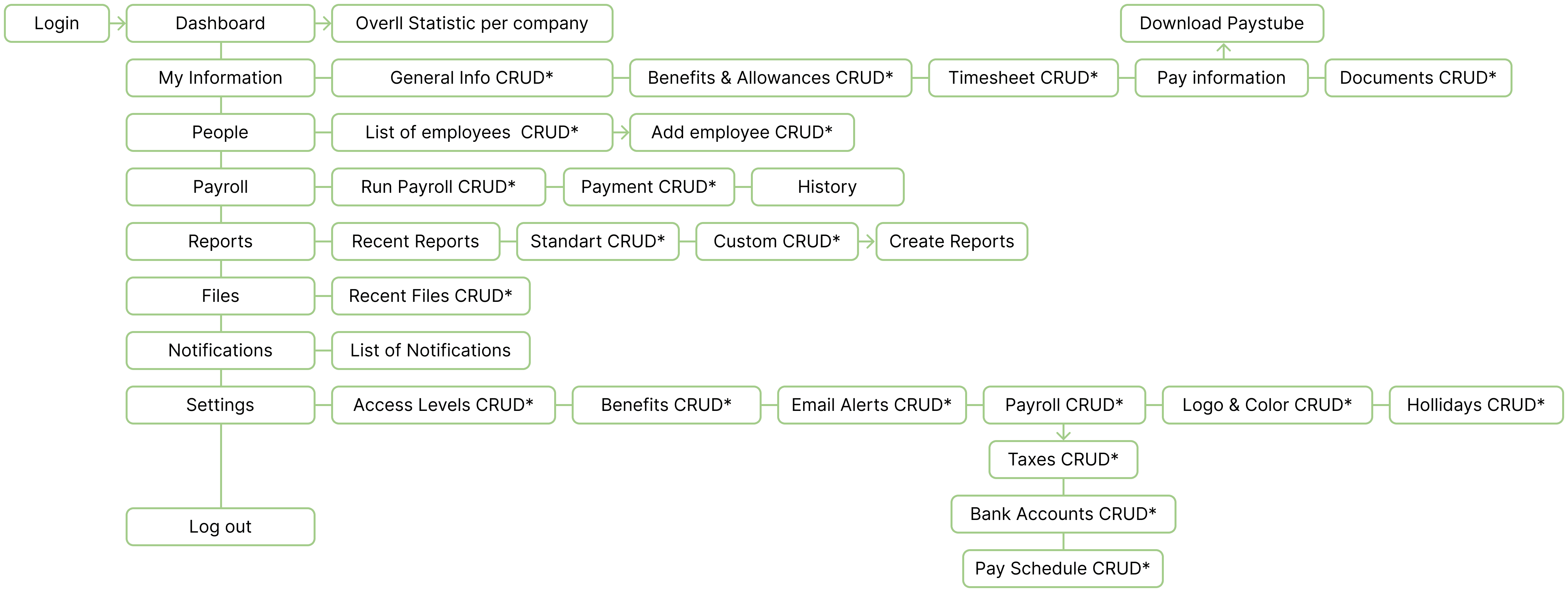 Super admin registers on the platform. Fills in information about their company and employees. Configures tax rates and rules. Regularly uses the platform for salary and tax calculation. Receives reports and documents for internal use and regulatory reporting. If necessary, utilizes additional features such as direct bank transfers and a mobile application for employees.
