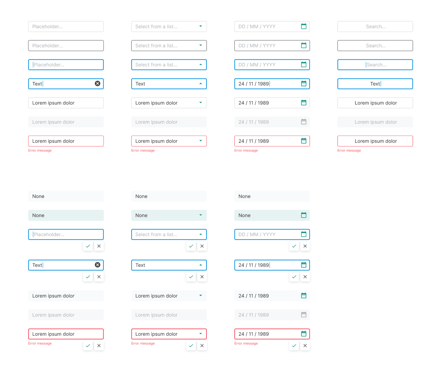 All the main atoms & components, colors & typography were described in styleguide, including their states and measures. Every design page was then built out of the styleguide.
